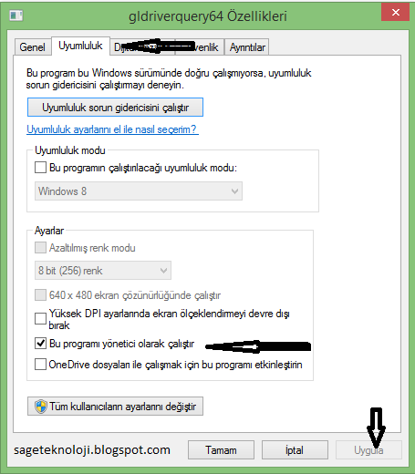 5- Uyumluluk penceresinden aşağıda bulunan “Bu programı yönetici olarak çalıştır” tikini işaretliyoruz. Sonrasında uygula kutucuğuna tıklıyoruz.